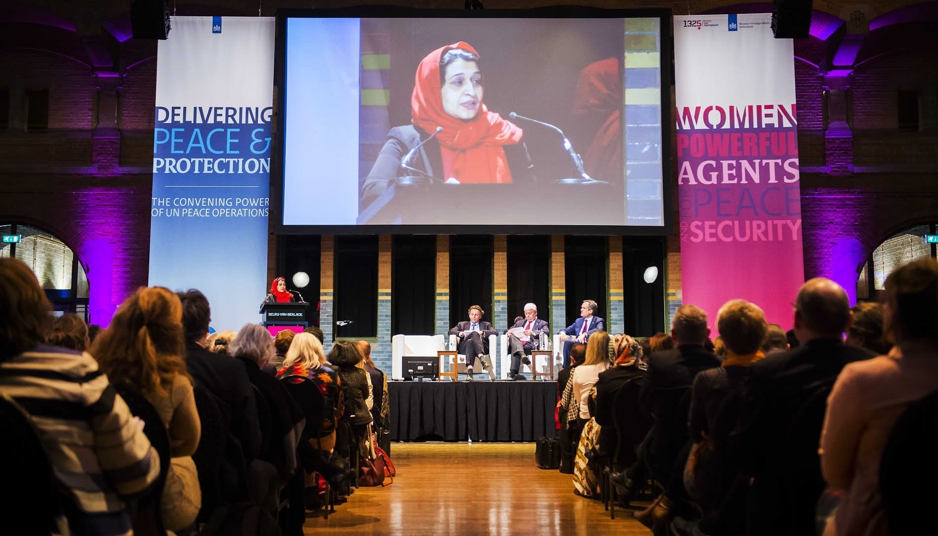 epa04624456 Hasina Safi, Director of the Afghan Women's Network, speaks during a meeting on UN peacekeeping missions in Amsterdam, The Netherlands, 17 February 2015. Representatives of more than forty European countries are gathered at the conference at the invitation of Dutch Foreign Minister Bert Koenders. EPA/REMKO DE WAAL